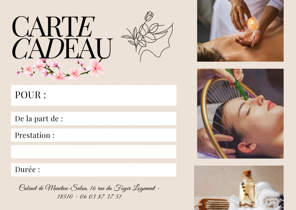 Lors de l’achat de la carte Cadeau, merci d’indiquer votre prénom, nom, numéro de téléphone, adresse mail ainsi que les coordonnées de la personne bénéficiant de la carte Cadeau, le type de massage soit :